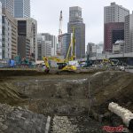 築堤はちょうど移設前の山手線、京浜東北線の線路下に埋まっていた。鉄道開業当時の路盤の上に約150年に渡って主要鉄道路線が走り、超満員の乗客を乗せた通勤電車が数分間隔で走っているというのは、実に感慨深いではないか。