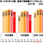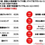 また、「夏の長距離ドライブ中に車内でかけると夏気分が盛り上がる曲」の項目では、40代、50代ともにTUBEの「あー夏休み」がトップに。20・30代ではWhiteberryの「夏祭り」が1位となっています。