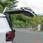 また、リアビューにアクセントを加えるデザイン性も魅力。単なる機能パーツとしてだけでなく、カスタムアイテムとしても車両の存在感を高めます。もちろん、オリジナル製作の上下ステーはどこにも干渉しない設計で、リアガラスの開閉で荷物の出し入れを犠牲にしません。