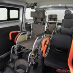 福祉車両の「チェアキャブ」は、スロープから車いすのままスムーズに乗り込めるのが強み。使い方に応じた3つの室内レイアウトを用意し、車いすやストレッチャーの乗員を含め5〜7名が乗車可能だ。乗降用手すり、オートステップ、助手席スライドアップシート(オプション)など、介助者や自立歩行の方にも配慮した装備がポイントになっている。
