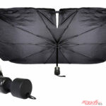 普通車やミニバン、軽自動車までもフロントガラスサイズをカバーできるよう設計されています。設置時は傘を開く感覚で素早く広げるだけで、車内の熱と紫外線を約99.5パーセント以上カットできる仕様とのこと。
