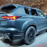 なかでも大きく張りだした前後のオーバーフェンダーや前後バンパーによる重厚感とボリューム感のある筋肉質なフォルムは魅力的。ボディカラーには光の当たり具合によってブルーのハイライトが浮かび上がってくる凝ったマットブラックを採用し、走りの面ではワイドトレッド化と22インチ大径ホイールを装着。