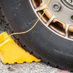 1.クルマを作業するのに安全な場所(平坦で硬い地面の場所)まで移動し、Pレンジ、パーキングブレーキなどを使用しエンジンを切って停車する(やむをえず傾斜地で作業を行う場合は交換するタイヤの対角線上のタイヤの下り側に輪止めを使用する)