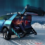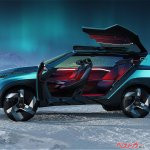 エッジの効いたボディパネルも魅力的だ。スノーギアの「アイゼン」をモチーフにしたフロントバンパーやサイドからリアへとシームレスに繋がる面構成が、独特の迫力とモダンさを生んでいる。ドアはフロントが前ヒンジ、リアはガルウイング式に開く。