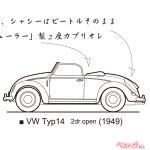 ところで、VWビートルはTyp1と呼ばれる。英語ではTypeのドイツ語がTypで、Typ1がビートル一族、ちなみにヴァンやマイクロバスはTyp2である。そのTyp1のなかでも、いわゆるビートルはTyp11、その派生モデルとしてカルマン社製カブリオレはTyp15、「ヘブミューラー」はTyp14とされた。