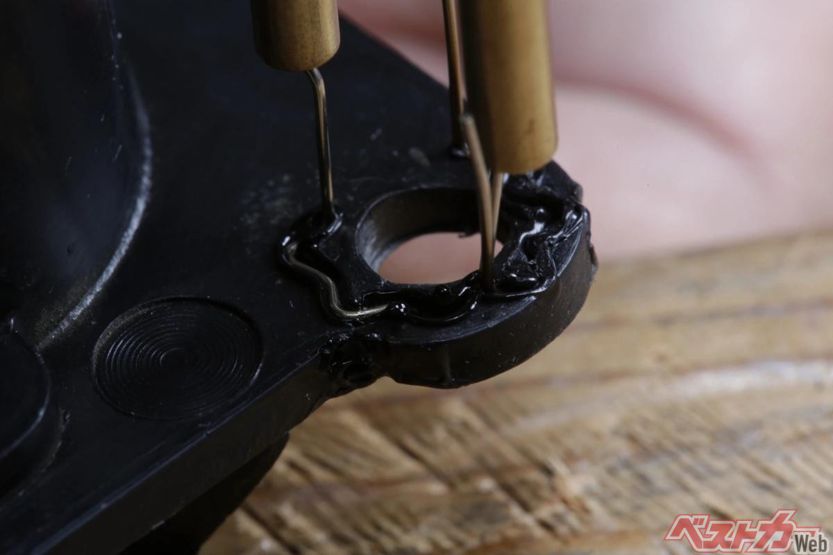 そんな中で失敗のリスクを減らすには、溶接部分の溶け方をしっかり観察しながら作業することが肝心です。ハンダごてでも樹脂リペアキットでも、常温の樹脂に当てた直後からすぐさま溶け始めるわけではありません。