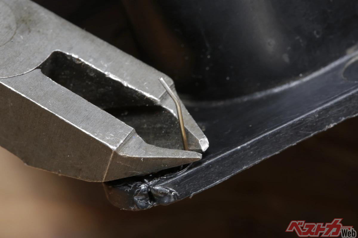 電気でステンレスピンを加熱して樹脂溶接を行うリペアキットは多くのメーカーから発売されている。ピン形状もさまざまだが、溶接部分を効果的に補強できるよう市販状態そのままで使うだけでなく補修部分に合わせて加工すると良い。
