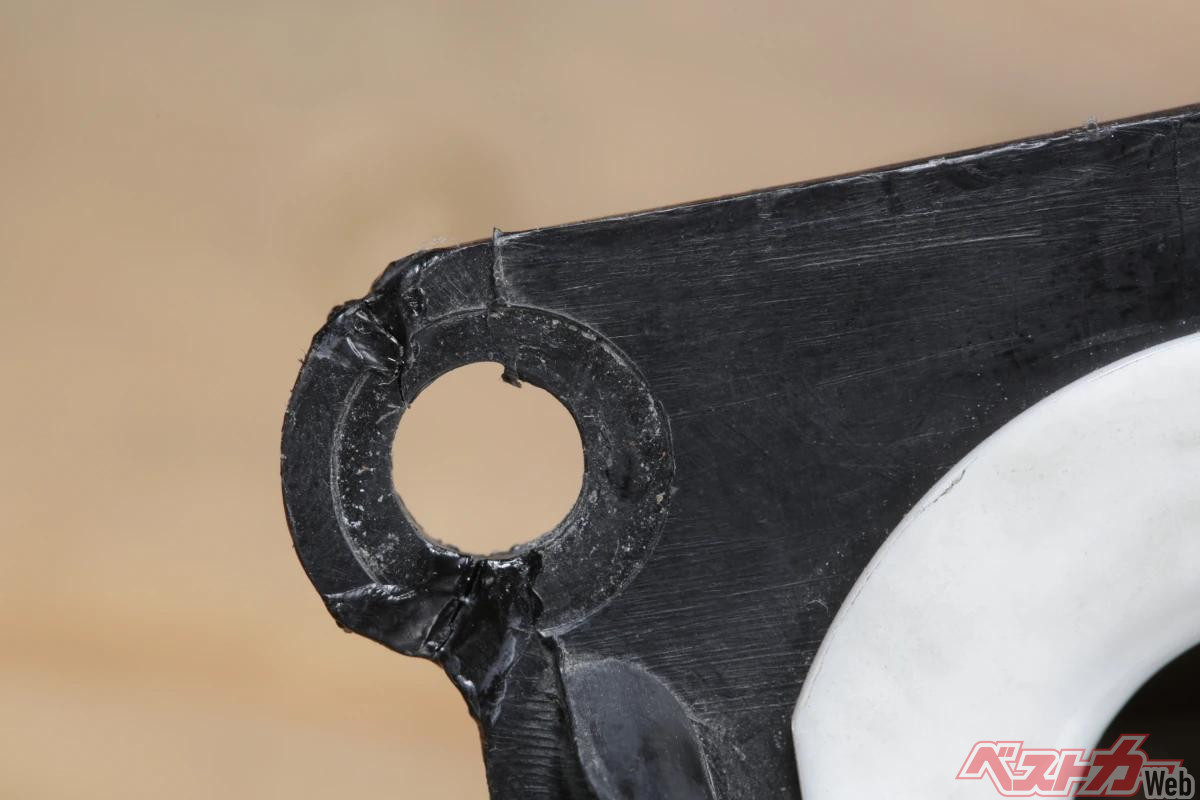 新車当時は多少曲げてもひねっても追従する樹脂製パーツですが、時間の経過とともに柔軟性が低下する特性もあります。
