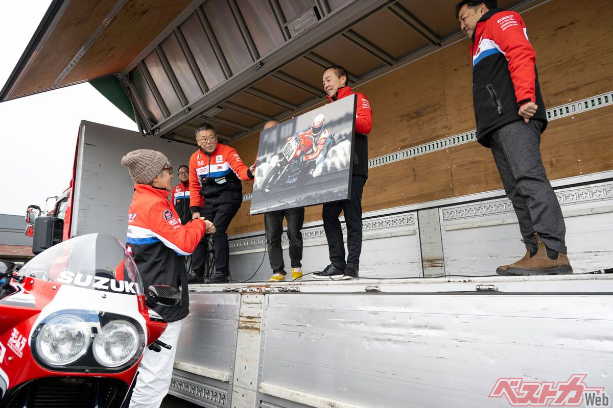 1月11日、ヨシムラは自社イベントの「ツーリングブレイクタイム」を、岡本さんが経営するSBS奈良橿原で開催し、その中で#604コンプリートの納車セレモニーを行った。イベントにはヨシムラの加藤陽平社長、そしてオリジナルの#604号車をライディングした辻本聡氏も会場に駆け付け、納車セレモニーで岡本さんに特別仕様のキーと記念品を贈呈。初めて目の当たりにする#604コンプリートマシンを前に、岡本さんは感極まった表情を浮かべていた。