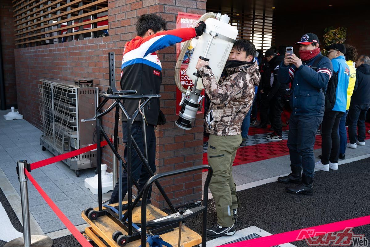 納車セレモニーでは岡本さんに記念のキーが手渡された。会場に集まった多くのファンの前で、岡本さんはエンジンを始動した。セレモニー当日は寒気の到来で気温が低かったこともあったが、岡本社長の手は心なしか震えて見えた。