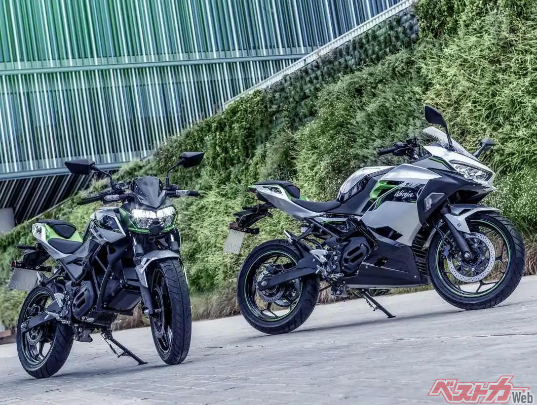 電動モーターサイクルは、2025年に発売されたカワサキのNinja e-1(写真右 106万7000円)、Z e-1(101万2000円)のみ。ともに原付二種(~125cc相当)クラスだ。
