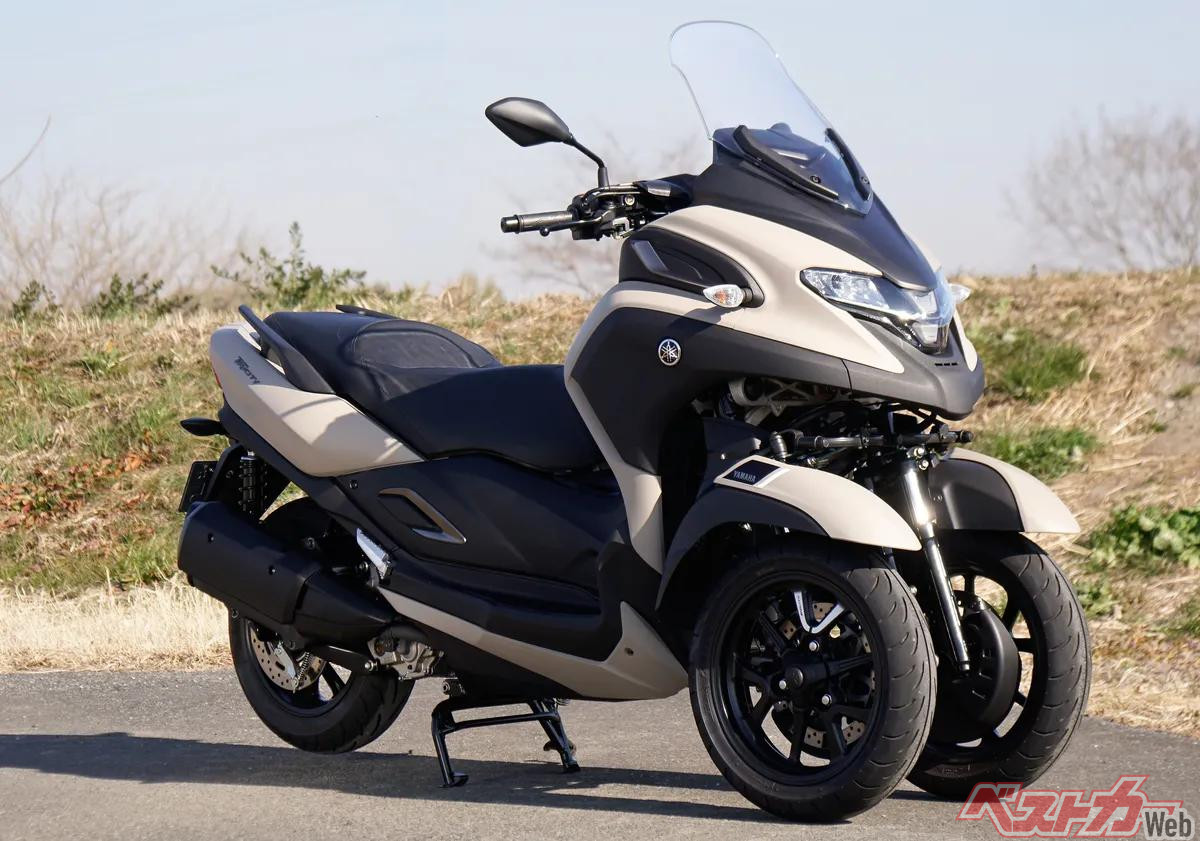 車両および車体が傾斜(リーン)して旋回する3輪以上のモビリティを、ヤマハは「LMW(Leaning Multi Wheel)」と呼んでいる。その第一弾として2014年に「トリシティ125」、第二弾として2017年に「トリシティ155」が登場。そして、2020年に追加ラインナップされた「トリシティ300」が「LMW」シリーズの最大排気量モデルで、独自の機能「スタンディングアシスト」を装備しているのが大きな特徴だ。
