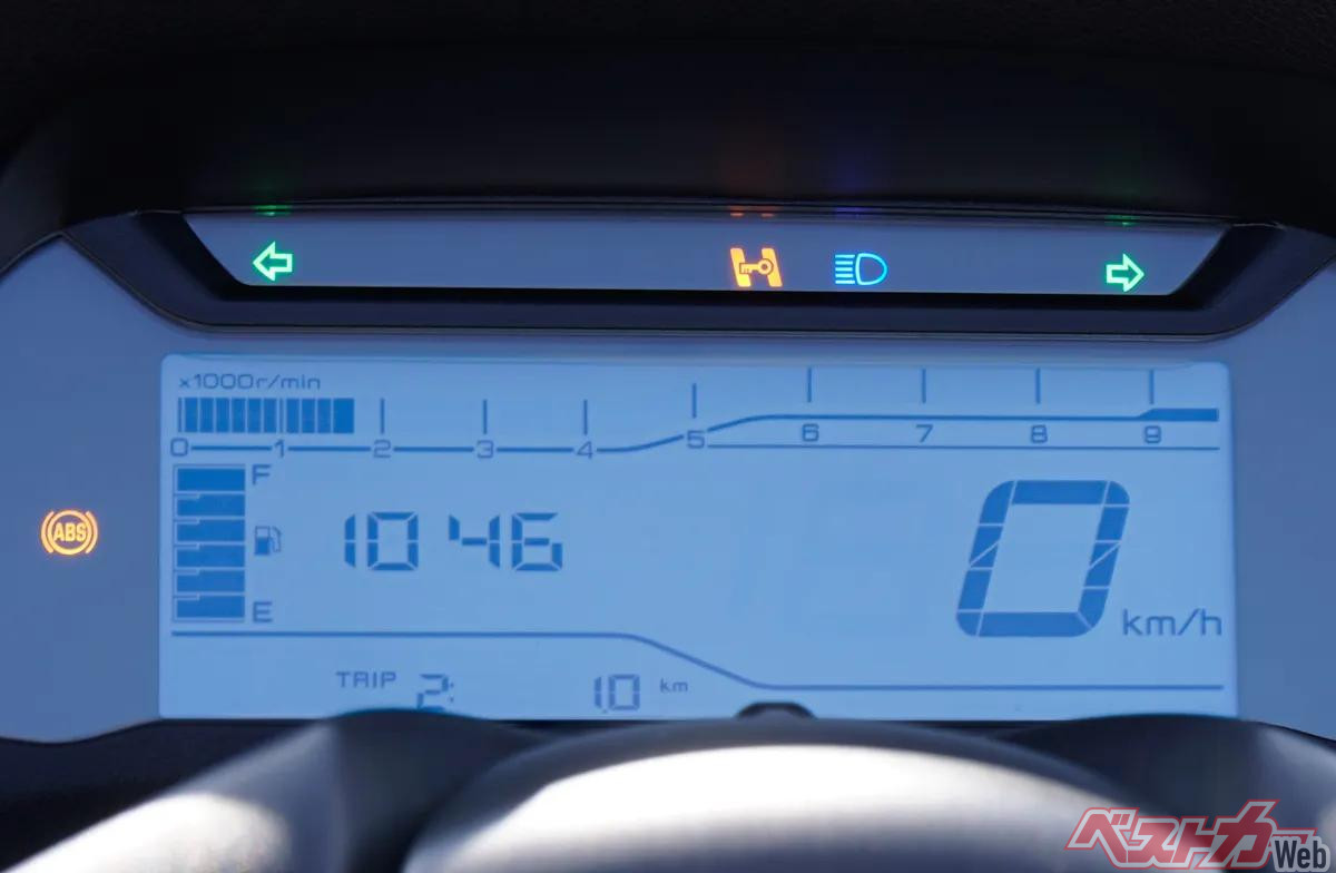 速度、エンジン回転数、ガソリン残量などを表示する大型のフル液晶メーター。ハイビームインジケーターの左は、「スタンディングアシスト」作動を表示している。