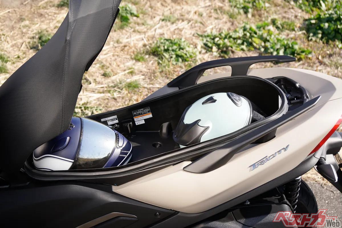 シート下収納は容量45L、最大荷重5kg。今回使用したフルフェイスヘルメット2個を収納できた。シートにはダンパー、収納スペースにはLED照明を装備。