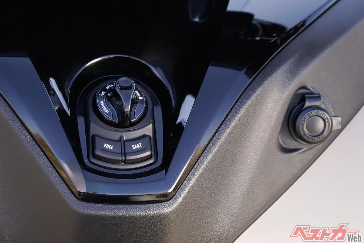 電源のON/OFF、エンジンの始動/停止、シートと給油口のロック解除はスマートキーで操作できる。12VのDCジャックも標準装備。
