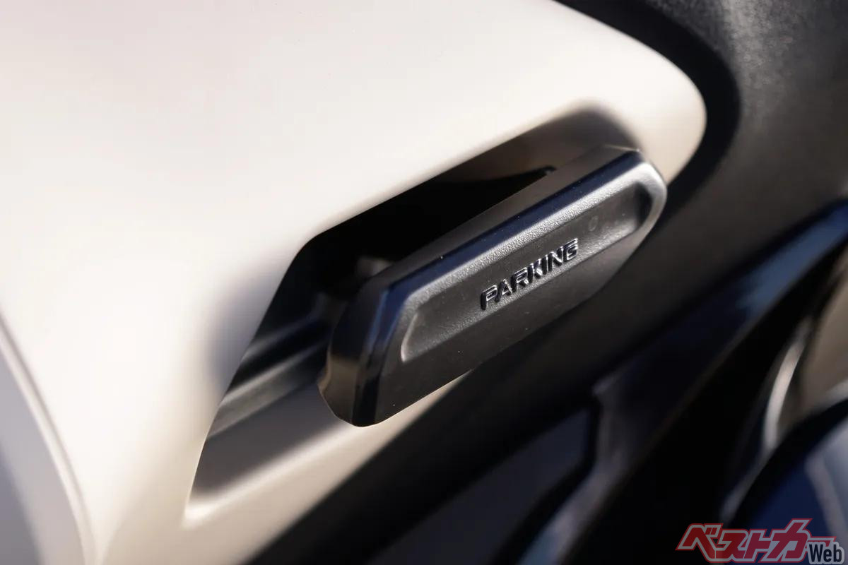 一時停車時に便利なラチェットレバー式のリヤブレーキロック機能を搭載。画像はリヤブレーキをロックさせた状態。レバーの操作性も良好だ。