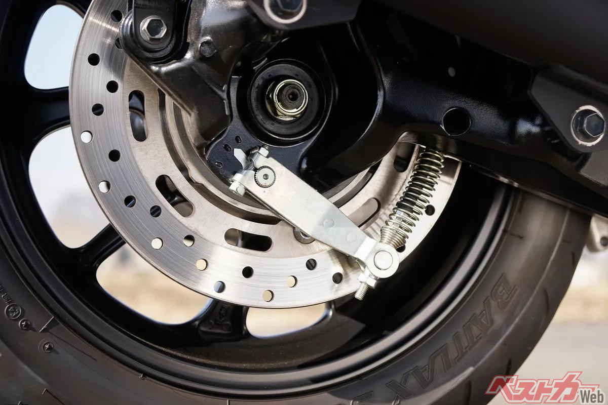 ブレーキはジワッと制動力が立ち上がり、リヤブレーキをかけるとフロントブレーキも連動する「ユニファイドブレーキシステム」を装備。さらに前後輪ともにABSが装備されているが、介入度は遅めでブレーキコントロールもしやすい。