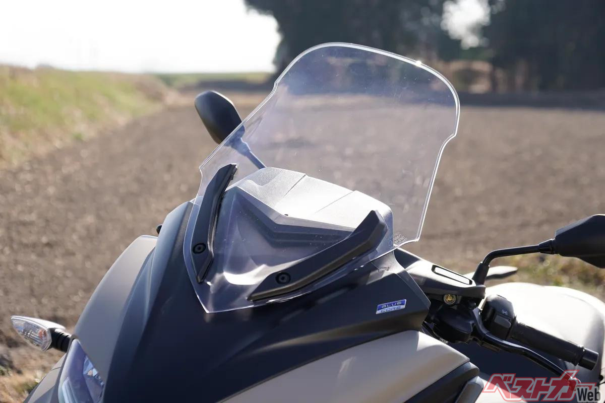 固定式で高さ調整はできないが、ライダーに当たる走行風を軽減するスクリーンを装備。クリアで視界を妨げない形状。
