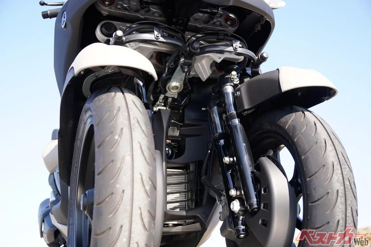 その乗り味を実現している要因が「LMWアッカーマン・ジオメトリー」で、コーナリング時に左右輪が異なる傾斜角となることで左右輪の軌道が同心円を描き、スムーズな旋回性能を発揮する。ただし、前2輪は左右それぞれで独立した「片持ちテレスコピックサスペンション」を装備し、左右のサスペンションは「パラレログラムリンク」で平行が保たれ、「タイロッド」で前2輪のリーン軸と操舵軸をオフセットさせるという独自の機構が必要となっている。「LMWアッカーマン・ジオメトリー」は優れた機構である一方、重量増とフロントまわりを大きく感じさせる要因でもあると個人的には思っていた。