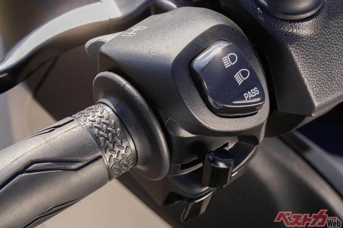 ハンドル左側のスイッチボックス前方にあるのが、「スタンディングアシストスイッチ」。操作性がよく、アラーム音とメーター内の表示灯で作動状況を確認しやすい。