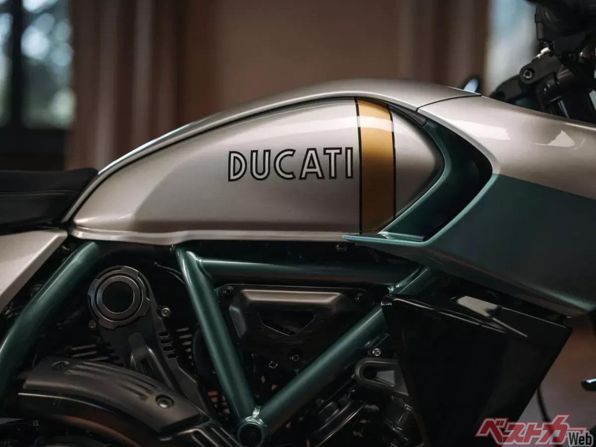 パワーユニットには、伝統のデスモドロミック機構を採用した803cc空冷L型ツインの「デスモドゥエ」を搭載。オフィシャルにはアナウンスされていないが、フレーム形状やスペックからは、ドゥカティ「スクランブラー アイコン」をベースとしているとみてよいだろう。エンジンは空冷ながらユーロ5+規制に適合しながらも最高出力73馬力を発揮し、低回転域からスムーズなレスポンスを実現している。