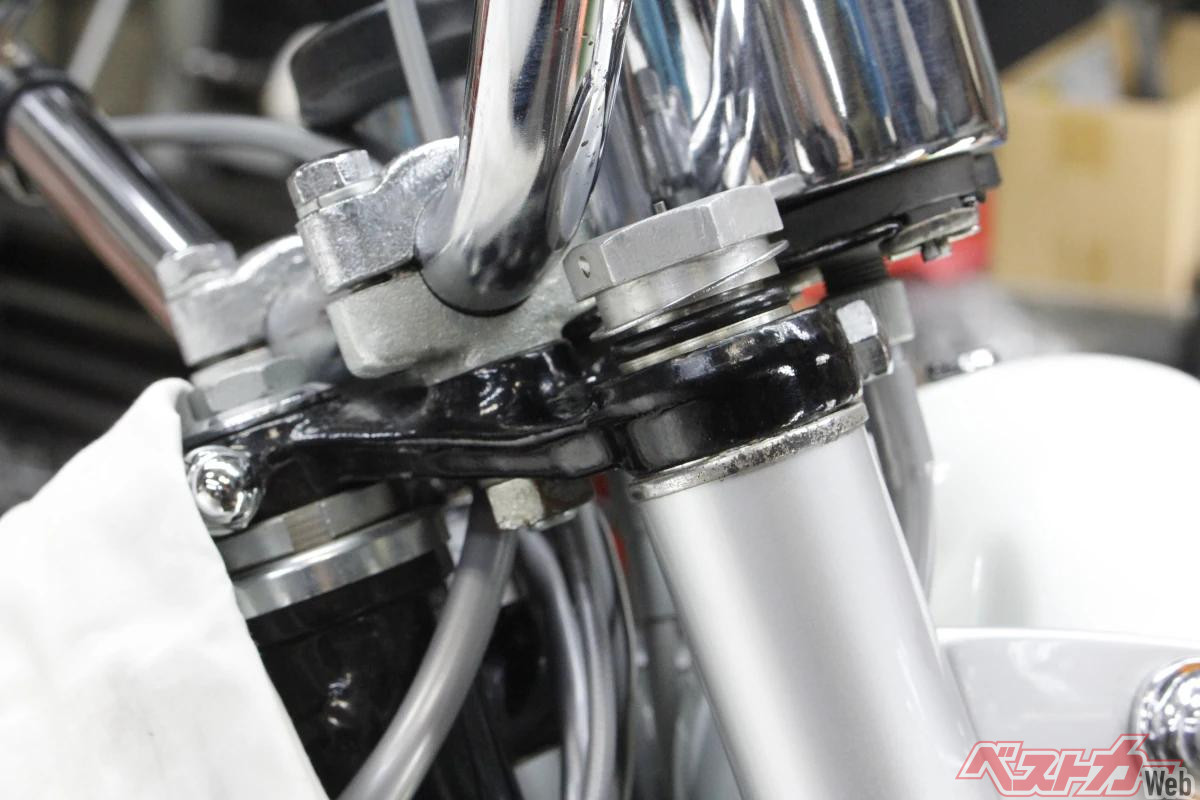 さて、そんな夏場や秋の長雨=湿気が原因で、ライトステーをマウントする「リングのサビが目立ち始めて……」と連絡が入った。部品調達した際には「ステンレス棒から削り出した部品を、バフ掛けでピカピカに輝かせてあります」と伺っていた。