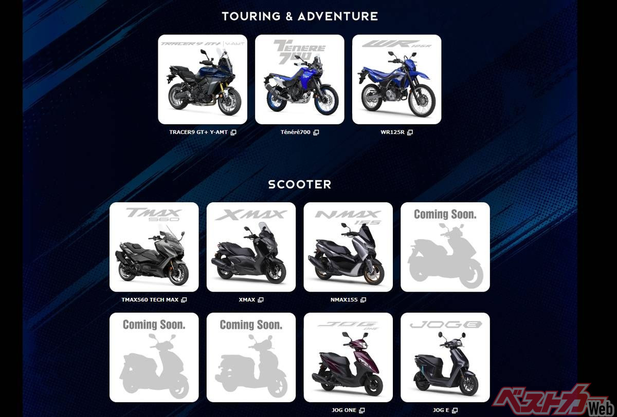 ・Touring & Adventureゾーン:TRACER9 GT+ Y-AMT、Ténéré700、WR125R、TMAX560、XMAX、NMAX155