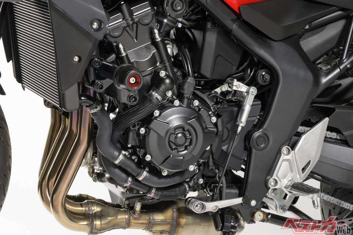 今回、モーターサイクルショーでは「参考出品車」としての展示となるため、詳細な諸元は明らかになっていない。そこで昨年の欧州発表を参照すると、スイングアーム長/トレール量はホーネットよりも延長されており、ホイールベースは1455mmから1465mmに長くとられる。前後重量配分も見直されているほか、車両重量229kgと軽量に抑えられている。そしてアップライトなライディングポジション、厚みを増したシートで快適性を向上させつつ、シート高は825mmに設定されている。