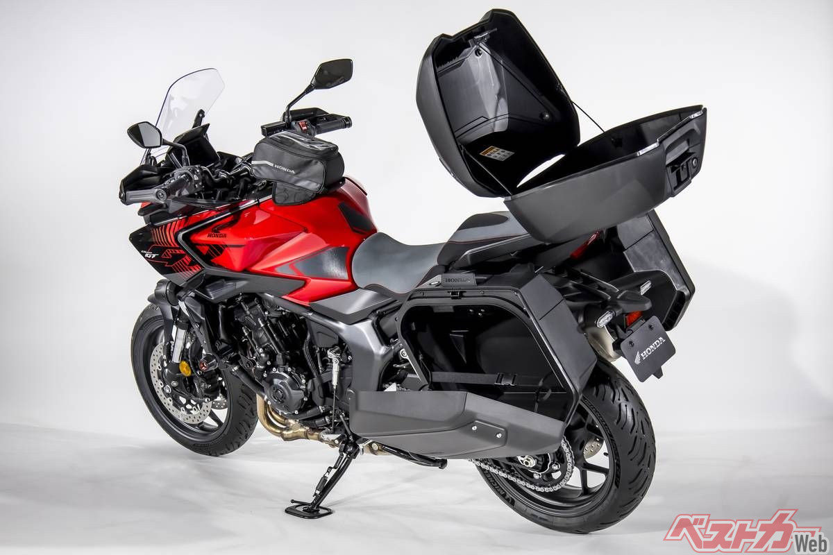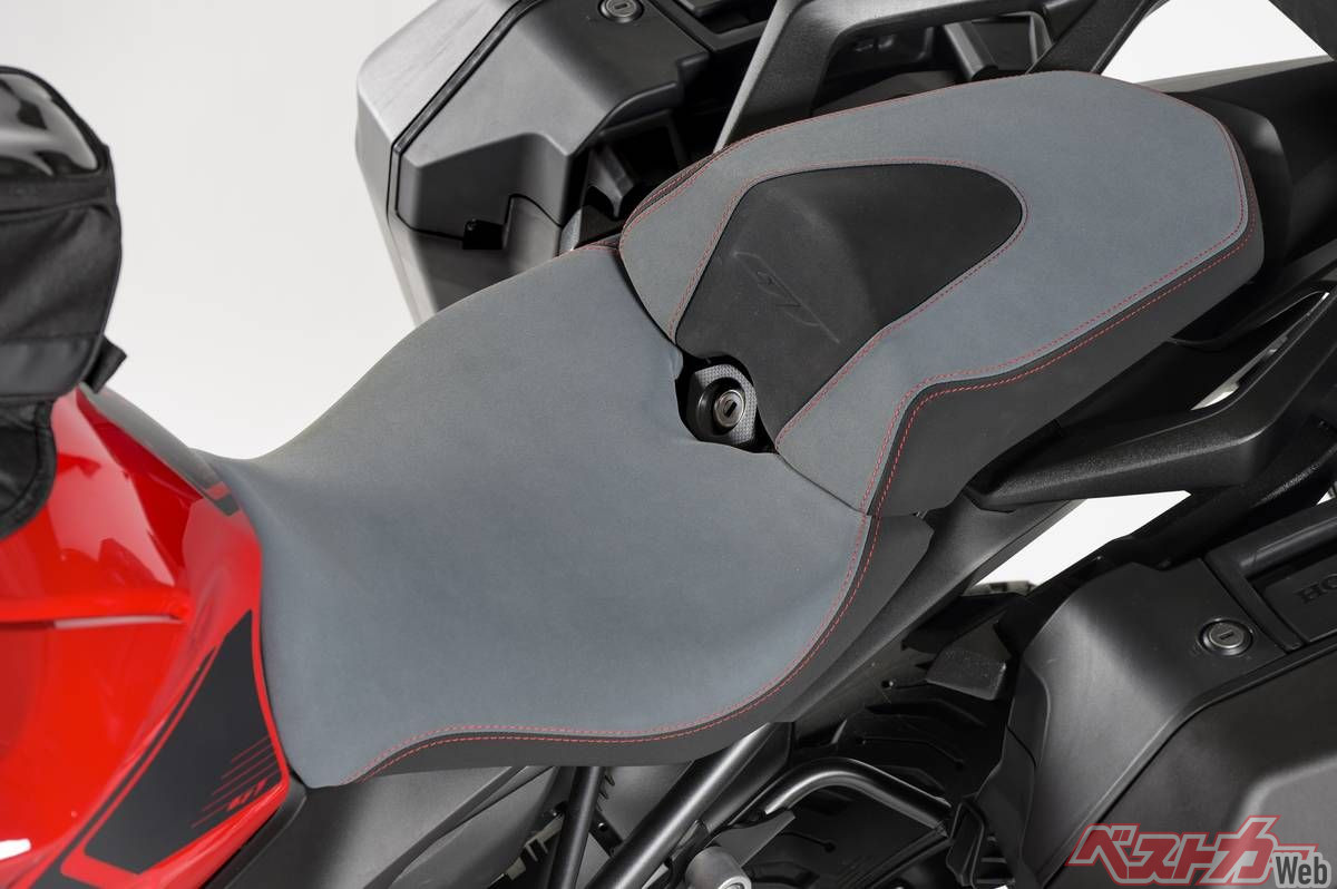 そしてサスペンションには、ショーワ製の電子制御サスペンション「Showa-EERA(エレクトロニカリー・イクイップド・ライド・アジャストメント)」を装備。センサーとして日本精機製6軸慣性計測ユニット(IMU)が標準装備されており、幅広い走行条件下で最適なコンプレッション/リバウンドダンピングレスポンスが得られる仕様だ。このシステムはECUからの車速情報、IMUからの車体姿勢情報、ストロークセンサーからのフォークの挙動情報という3つの情報に基づいて、ストローク速度に応じて最適なダンピング力を自動的に調整できるという。さらに制御系では専用のPGM-FIとTBW(スロットル・バイ・ワイヤ)セッティングにより、長距離走行性能を重視するコンセプトに基づいて、スロットル開度初期におけるパワーデリバリーをスムーズにし、長距離走行時のライダーとパッセンジャーの疲労軽減を図った。