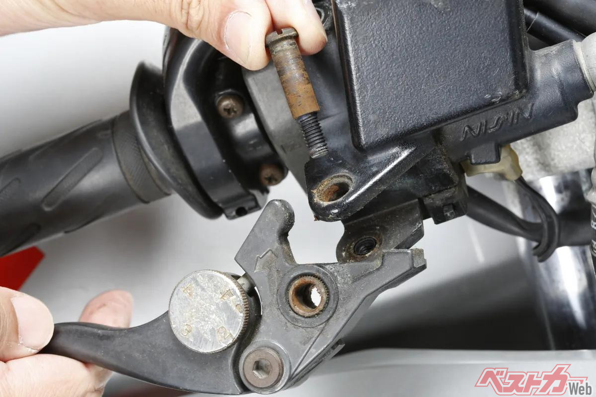 汚れやサビを落としたら摺動部にグリスを塗布してレバーを復元する。見ての通りレバーと接する摺動部とネジ部には段差があり、いくら強いトルクで締め付けてもレバーホルダーのガタはなくならない。逆にマスターシリンダー側の雌ネジを破損する原因になるのでオーバートルクは要注意。