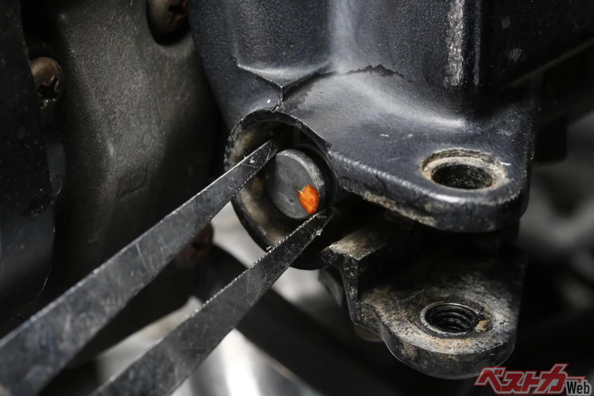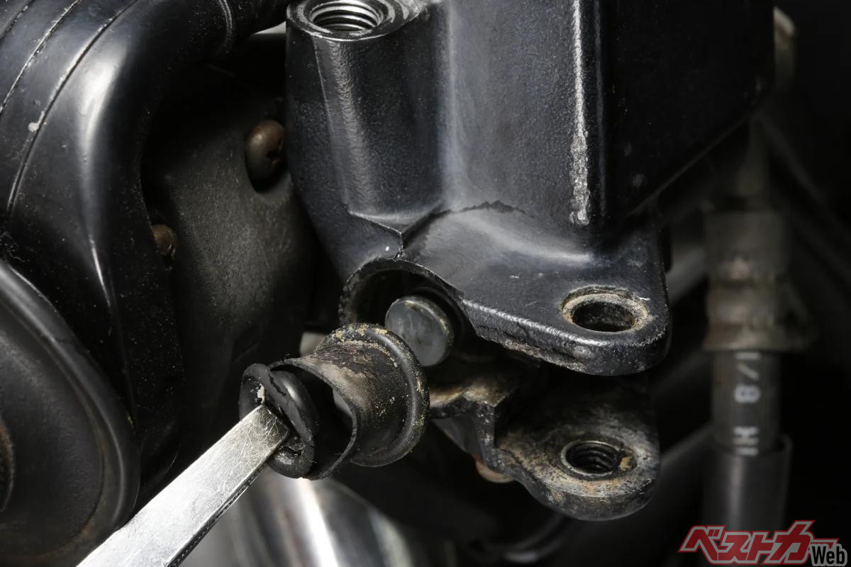 ピボットボルトが通るレバー側も洗浄し、綿棒などで内側の汚れを拭き取っておく。このレバーは耐摩耗性の高いブッシュを圧入してあるが、旧車や小排気量車に多いブッシュレスタイプのレバーは、潤滑不良のボルトと擦れ続けることで穴が変形してしまうこともある。