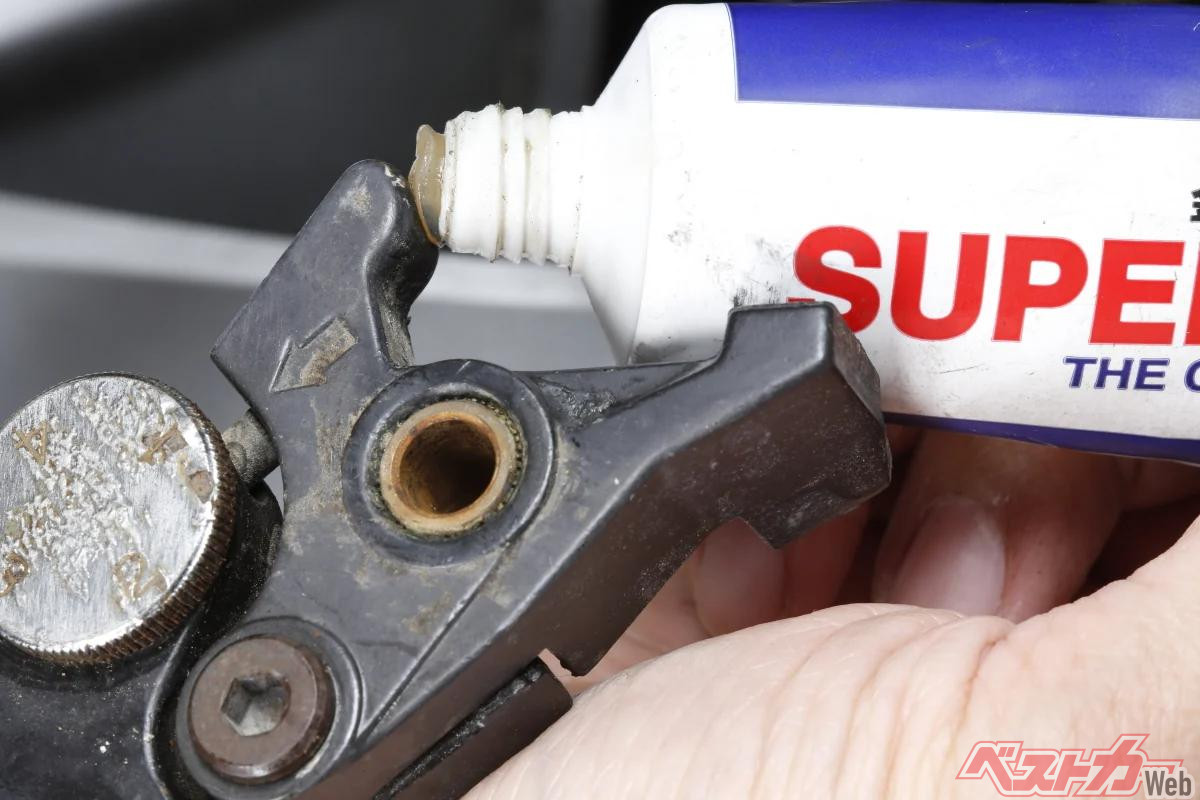 グリス不足による潤滑不良や汚れの付着はレバー操作時のフリクションロス増大とともに、ボルトやレバーの摩耗の原因にもなります。摺動部の摩耗によりクリアランスが広がるとブレーキレバーにガタが生じてタッチが悪化する上にレバーやマスターシリンダーの摩耗につながることもあります。