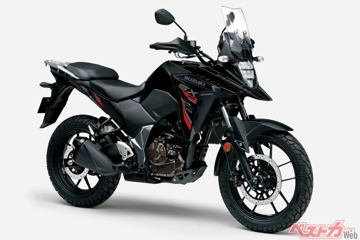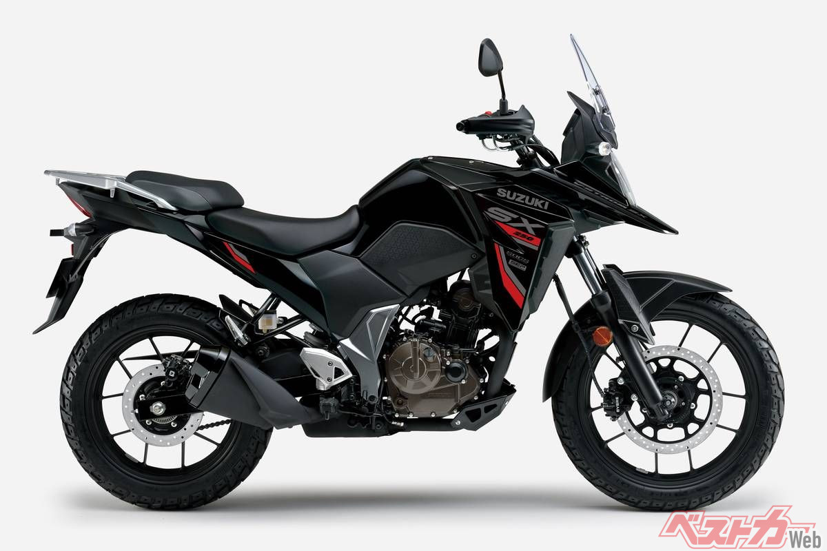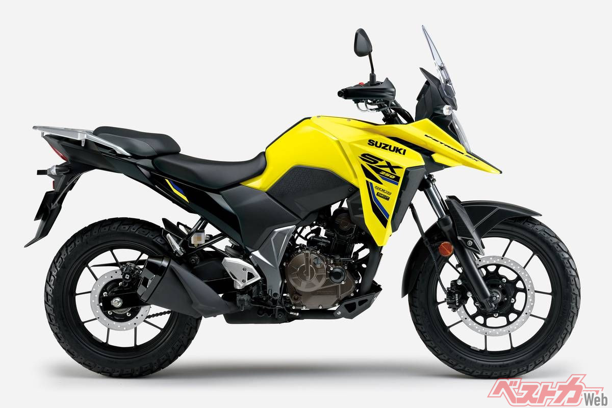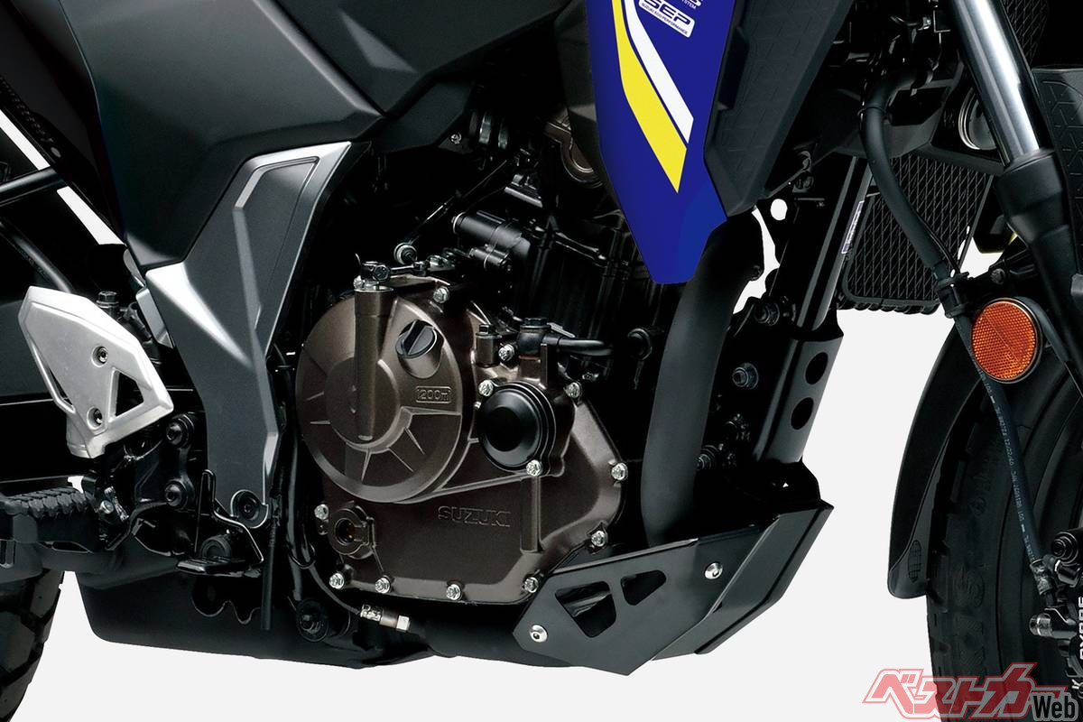 Vストローム250SXは、ツーリングでの快適性や未舗装路での走破性、日常での扱いやすさを兼ね備えたスポーツアドベンチャーツアラー。搭載エンジンは軽量でコンパクトな油冷249cm³単気筒SEP(スズキエコパフォーマンス)で、低速からの力強い加速性能を狙った特性。現行機では珍しい油冷エンジンだが、スズキオイルクーリングシステム(SOCS)を装着し冷却効率は高く、同じエンジンパッケージを共有する「ジクサー250/SF」と共に、高い信頼性と扱いやすい出力特性で根強い人気を誇る。