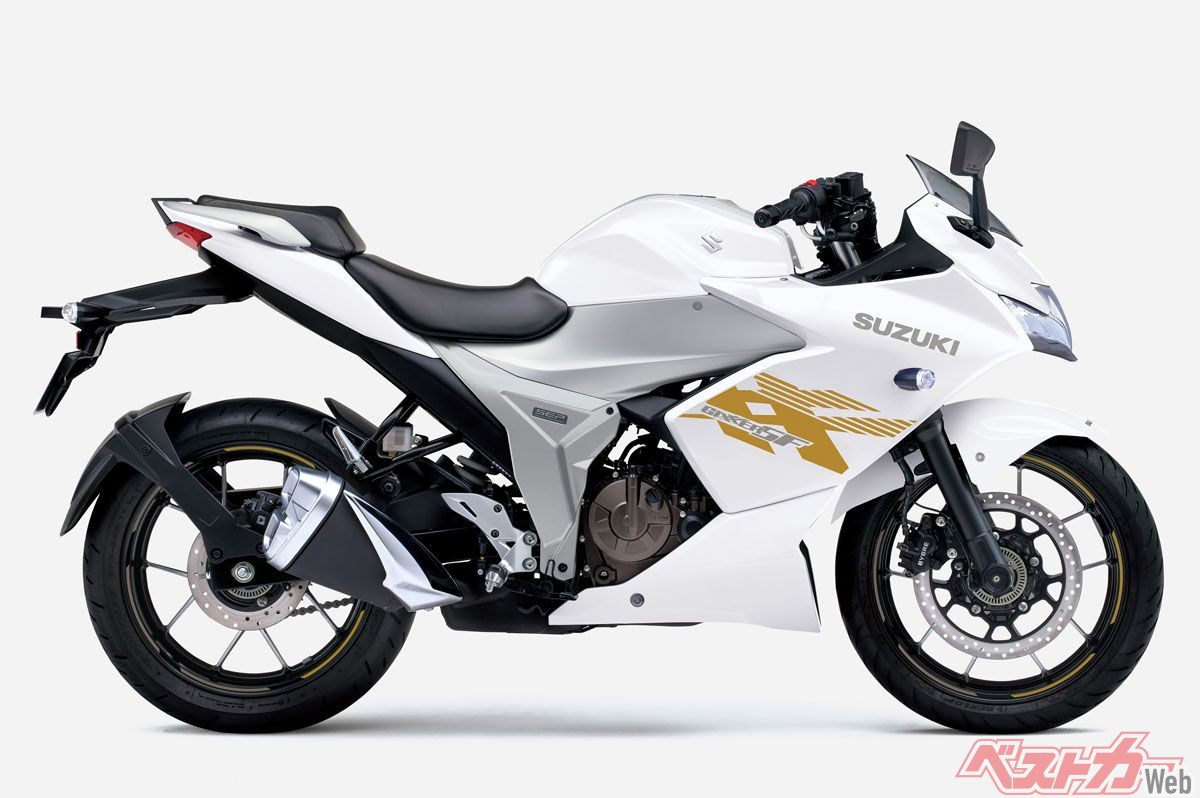 フルカウルのジクサーSF250はスポーティな「トリトンブルーメタリック/パールグレッシャーホワイト」を継続しつつ、ネイキッドと同様の「パールグレッシャーホワイト/マットプラチナシルバーメタリック No.2」、精悍な「グラススパークルブラック」の2色を設定、計3色のバリエーションを揃えている。