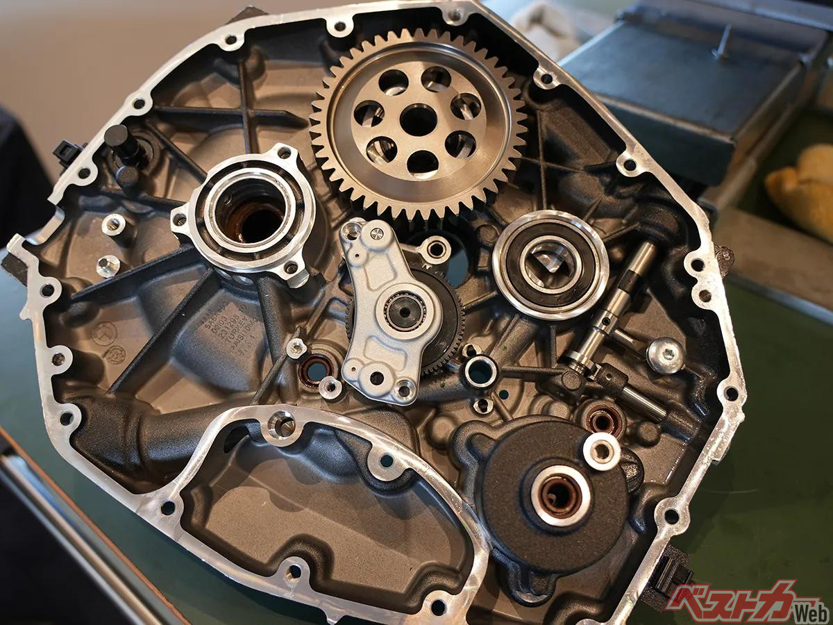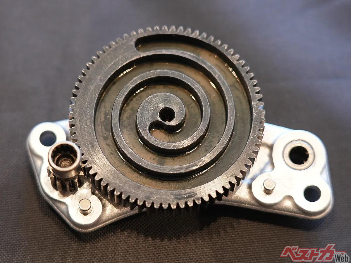 先にも触れたようにASAのクラッチはシングルタイプで、このクラッチのコントロールの要となるのが、アクチュエーターで駆動するうずまき状の特殊ギアだ。このギアがセンサーからの情報をもとに、左右に回転することでクラッチレリーズアームが作動する。ギアのうずまきのカーブに沿ってクラッチレリーズアームが動き、スムーズに油圧式のクラッチレリーズを作動させて適正に半クラを含めたクラッチの断続を制御する。