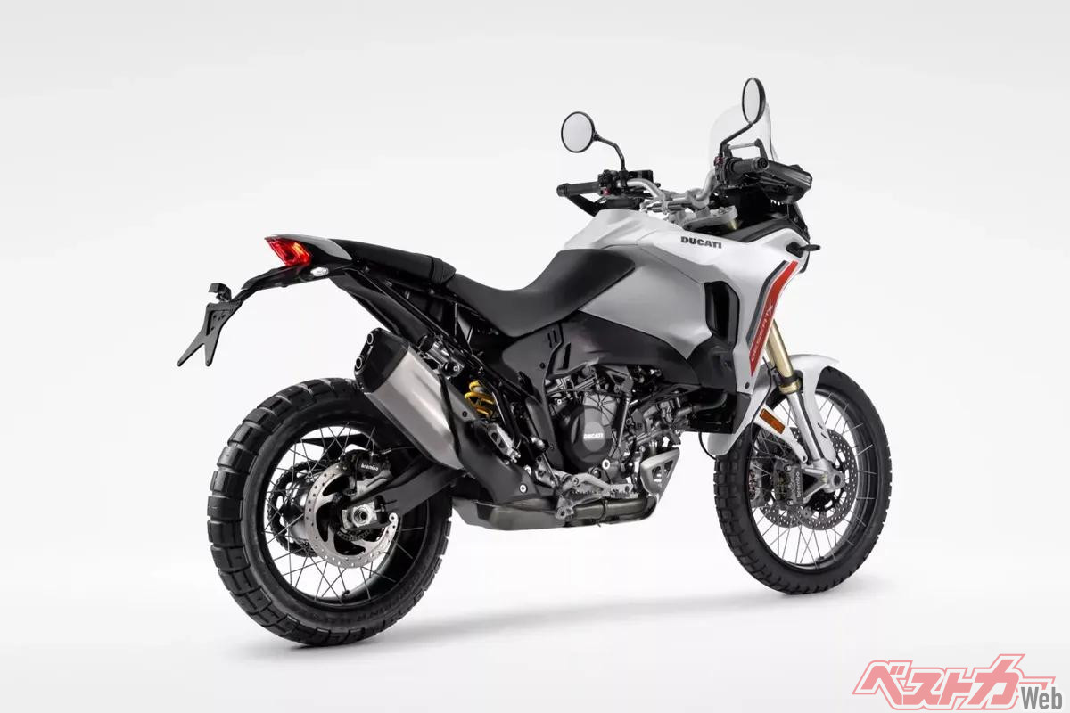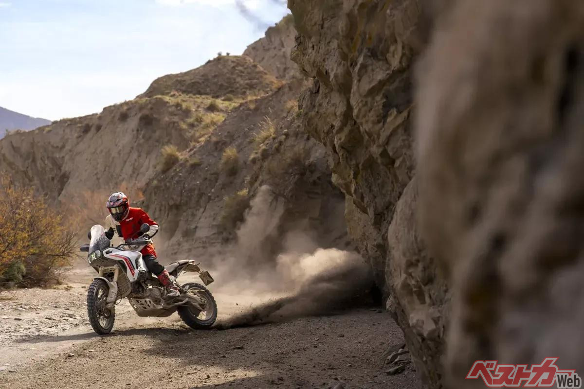 過酷な環境下でのマシンコントロールを支えるため、6軸慣性計測ユニットを軸とした最新世代の電子制御パッケージが搭載された。4段階のコーナリングABSやドゥカティ・トラクション・コントロールなどの多彩な支援機能がリアルタイムで介入し、安全性とパフォーマンスを高度に保つ。各電子制御は、スポーツやツーリングに加え、オフロード専用のエンデューロとラリーを含む全6種類のライディングモードに統合されている。外部センサーを廃して泥や埃への耐性を高めた新型「ドゥカティ・クイックシフト2.0」も備わり、よりダイレクトなギアチェンジを味わえる構造である。