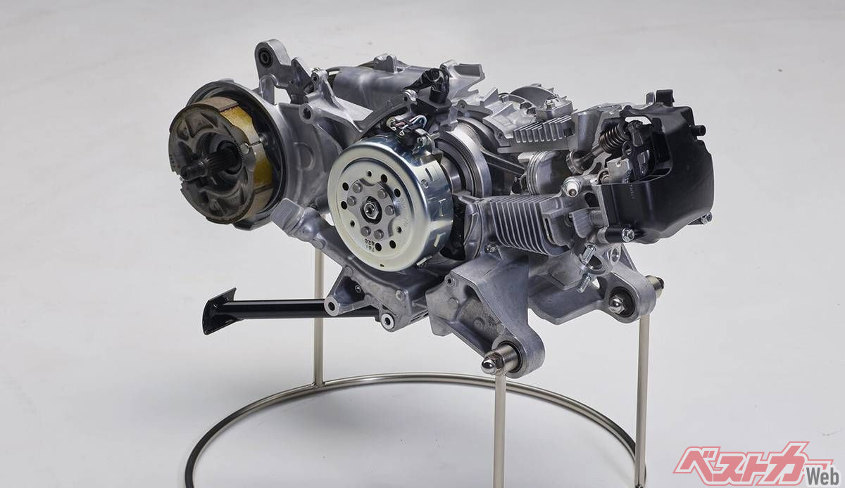 走行性能の要となるパワーユニットには、走りの楽しさと環境性能を高次元で両立させた124ccの空冷4ストローク単気筒エンジンを搭載している。高効率燃焼や高い冷却性、ロス低減に焦点を当てたブルーコア思想に基づき設計されており、最高出力は6.1キロワットを発揮。本モデル最大の特徴は、始動用モーターとジェネレーターを一体化したスマートモータージェネレーターシステムの採用だ。