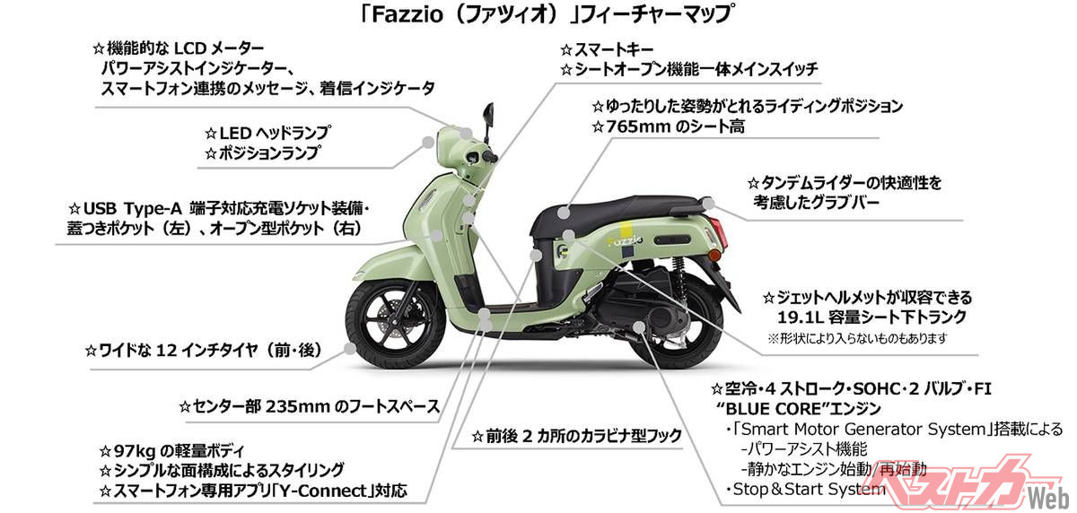 シート高は765ミリメートルに抑えられており、足を下ろしやすいフートボード端の形状によって良好な足つき性を重視。車体の各部には楕円形のオーバルモチーフが取り入れられ、LEDヘッドランプやLCDメーターパネル、前後に配置されたカラビナ型のフックに至るまで統一感を持たせている。足回りには前後ともにワイドな12インチタイヤを装着し、安定感のある走りをサポートする。実用的な装備も充実しており、シート下には容量19.1リットルのトランクを備え、ジェットヘルメットの収納に対応する。フロント部分には左側に蓋つき、右側にオープン型のポケットを配置したほか、利便性を高めるUSB端子対応の充電ソケットも導入された。これに加えて、スマートキーシステムやスマートフォン専用アプリとの連携機能も備わり、快適なスクーターライフを提供する。