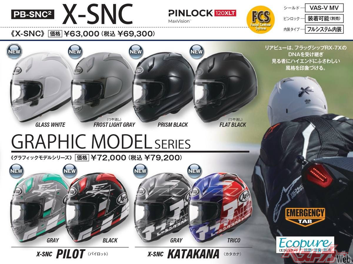 もちろん従来通りの装備も充実しており、内装には、抗菌・消臭・防汚性能を持つ「エコピュアー」を採用したハイフィッティング・アジャスタブル・エフシーエス内装を装備した。緊急時にヘルメットを脱がせやすくするエマージェンシータブも備えており、万が一の事態への備えも万全だ。シールドシステムには、確実な操作性と視界を確保する「VAS-V」タイプを採用し、ピンロックシートの装着にも対応している。ソリッドカラーはグラスホワイトやフラットブラック、プラチナムグレーなど、ストリートに映える洗練されたラインナップが揃う。まさに、軽快感と安心感、そして爽快感がひとつに溶け合う、次世代のストリートフルフェイスの誕生だ。