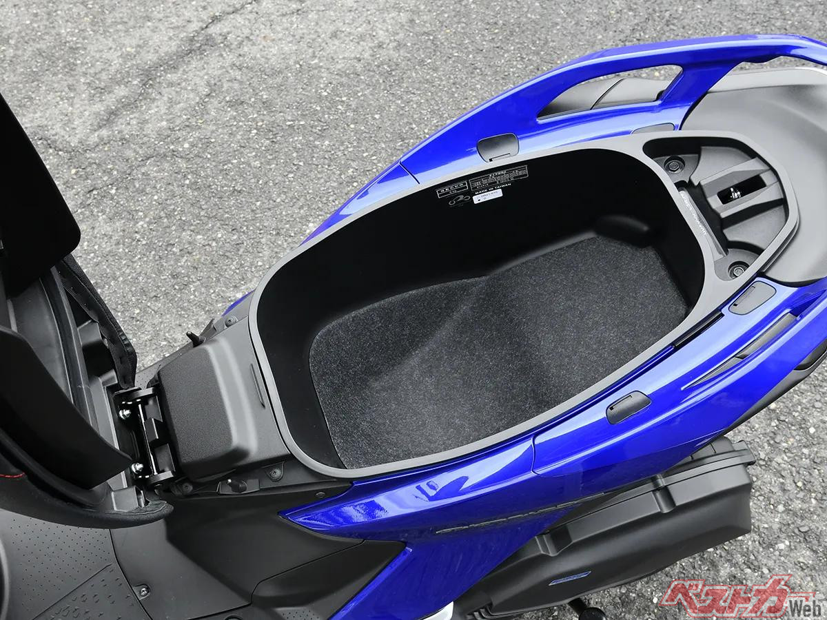 新型シグナスXはユーティリティ面でも大きく進化しており、シート下のラゲッジスペース容量は28Lとシグナス グリファスと同等だが、深さを見直すことでSHOEI製X-FourteenのXLサイズを無理なく収納することができるようになったという。これはシグナスXが大型バイクユーザーのセカンドバイクとして使われることが多いということを考慮したもので、大型バイクで使っているフルフェイスをそのまま使えるというメリットを生み出している。