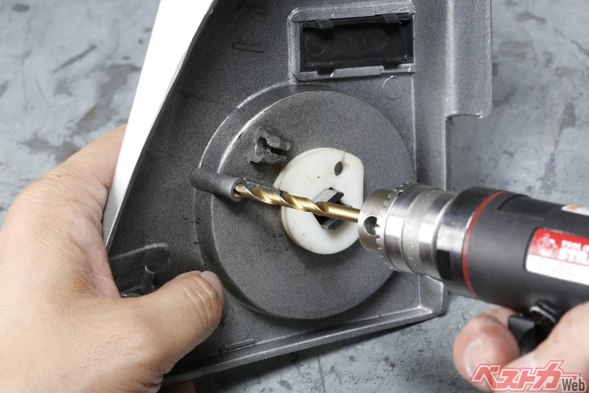 まず最初に行うのは補修箇所の清掃と脱脂です。ネジ穴の内部や周辺に油分や汚れが残っているとプラリペアが十分に密着せず、強度が低下する原因になります。パーツクリーナーやアルコールなどで汚れを除去し、乾燥させておくことが重要です。またビスとネジ穴の隙間が少なすぎるとプラリペアが行き渡らず雌ネジの強度も上がらないので、余裕があればドリルで下穴を拡大しておくのも有効です。