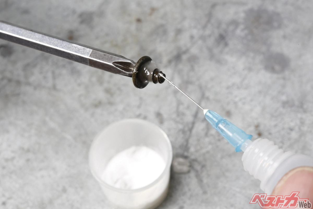次に、使用するビスにオイルやシリコンスプレーを薄く塗布します。この油分が離型剤代わりとなり、硬化後のプラリペアが貼り付くのを防止できます。プラリペアで雌ネジを再生する際に、下穴に充填したプラリペアにネジをねじ込む方法もありますが、今回はビスのネジ山にプラリペアを盛り付けてから下穴に挿入します。