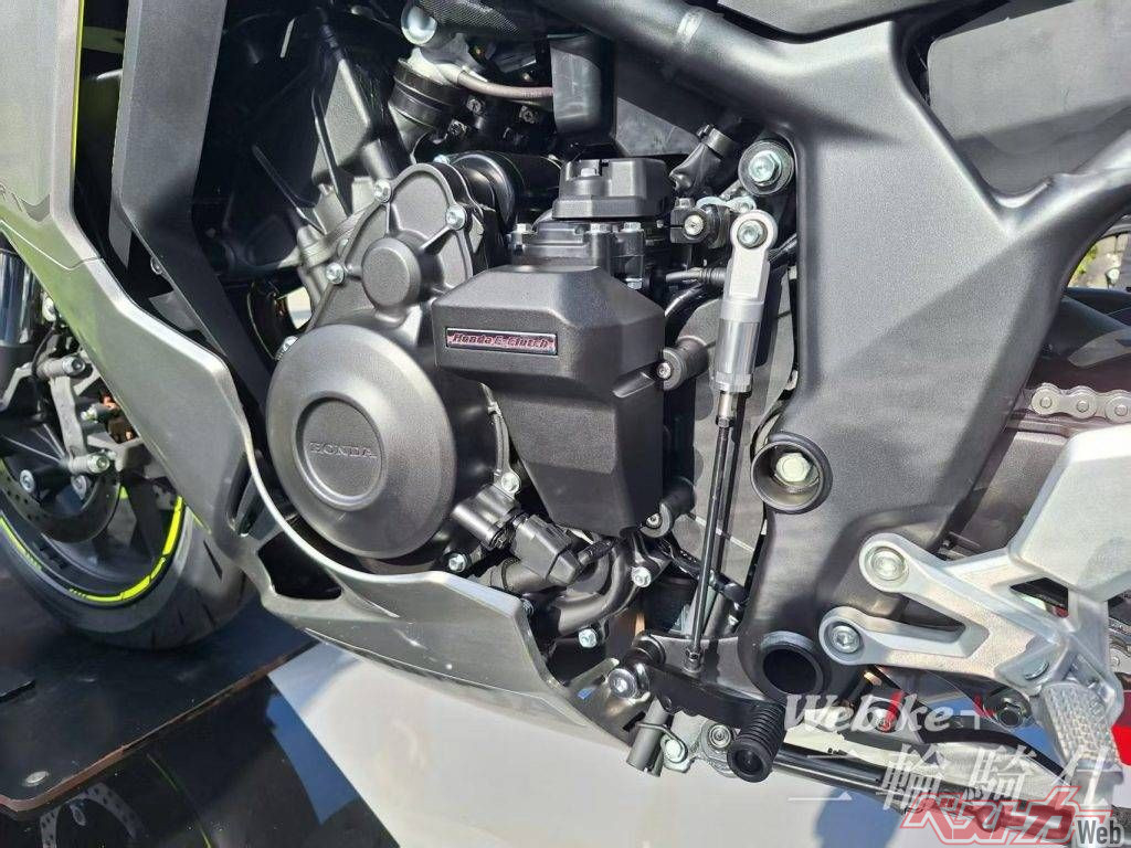 最先端の変速テクノロジー: 展示車両のディテールから、エンジンの右側にホンダ最新の「Honda E-Clutch(電子制御クラッチ)」システムが装備されていることが確認できました。これによりシフトチェンジがよりスムーズで爽快なものとなり、ライディングの楽しさが大幅に向上しています。