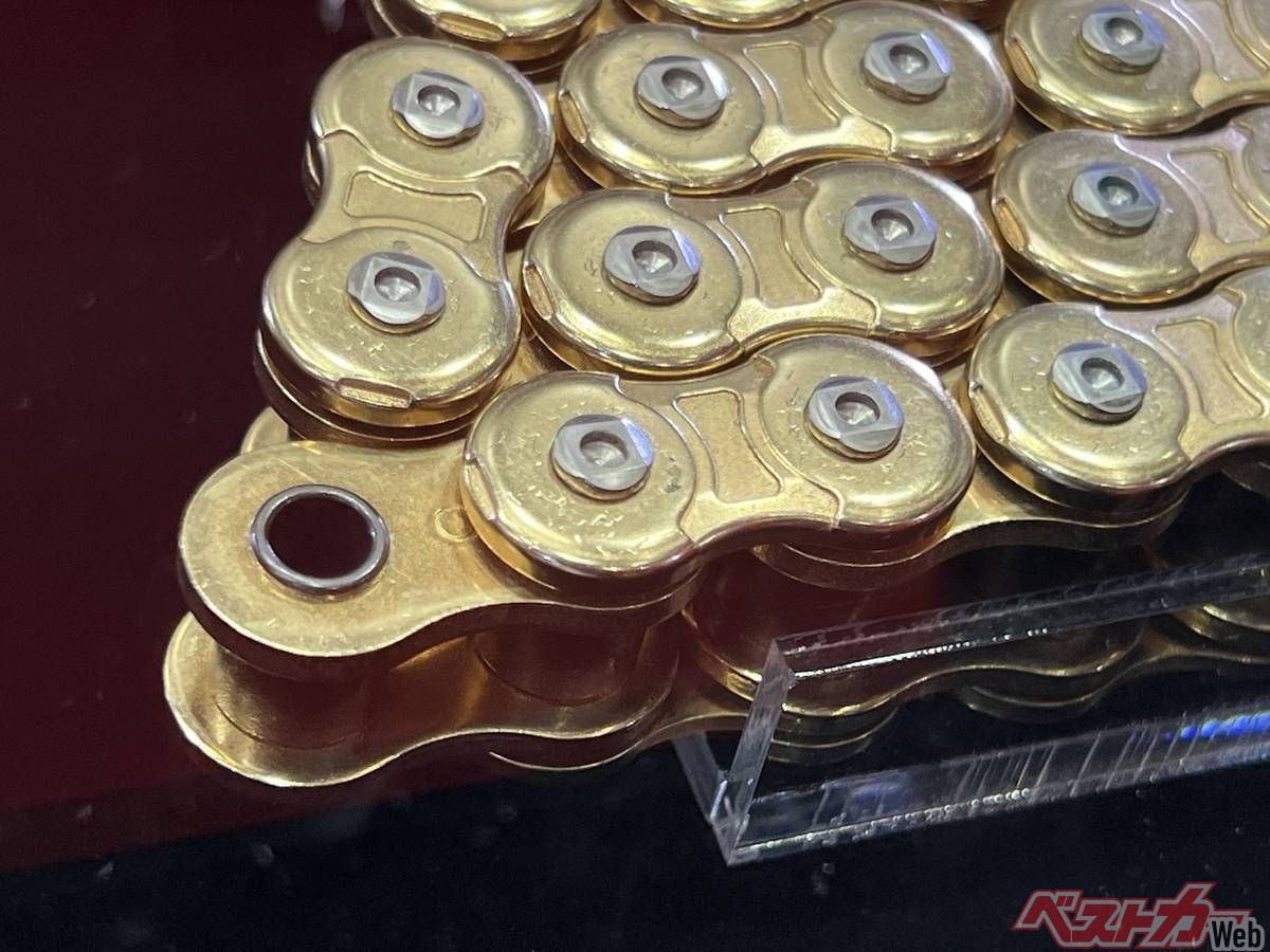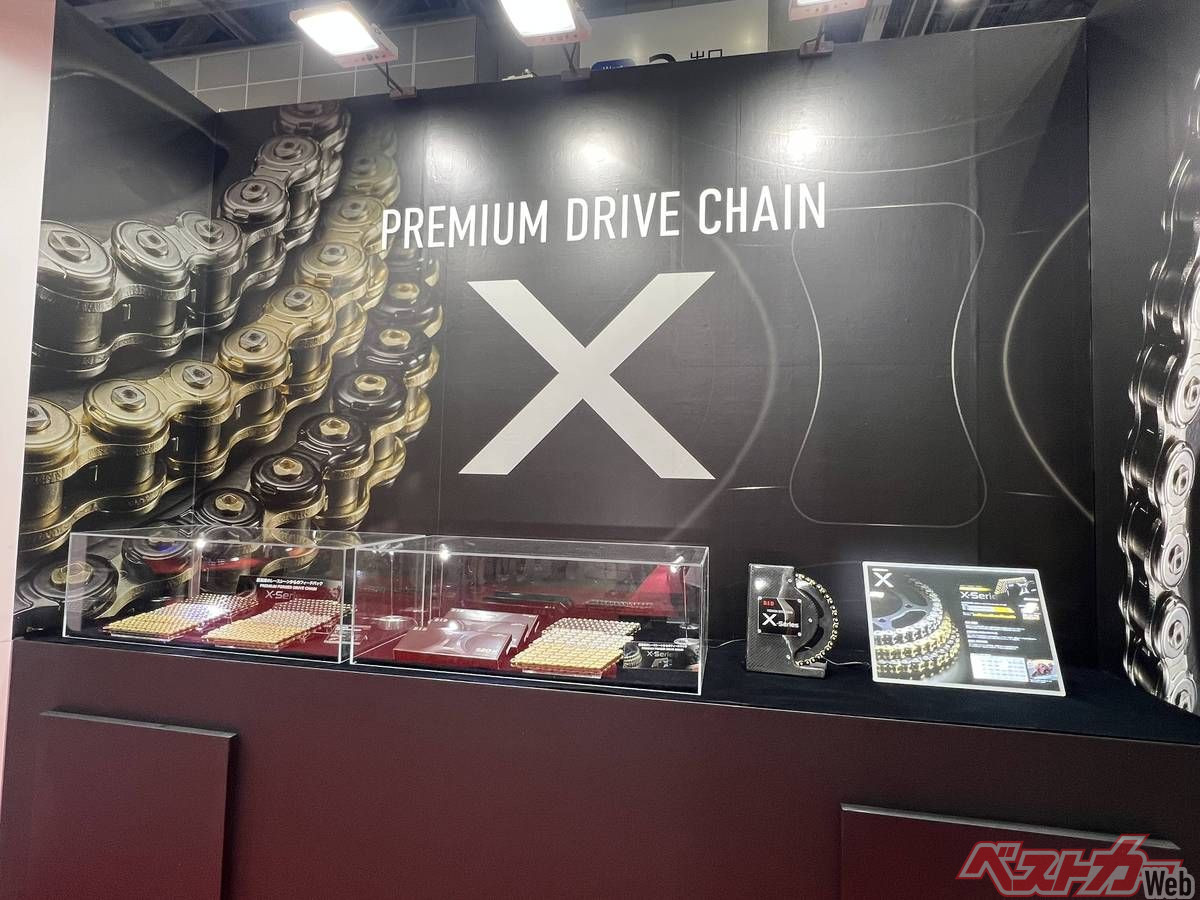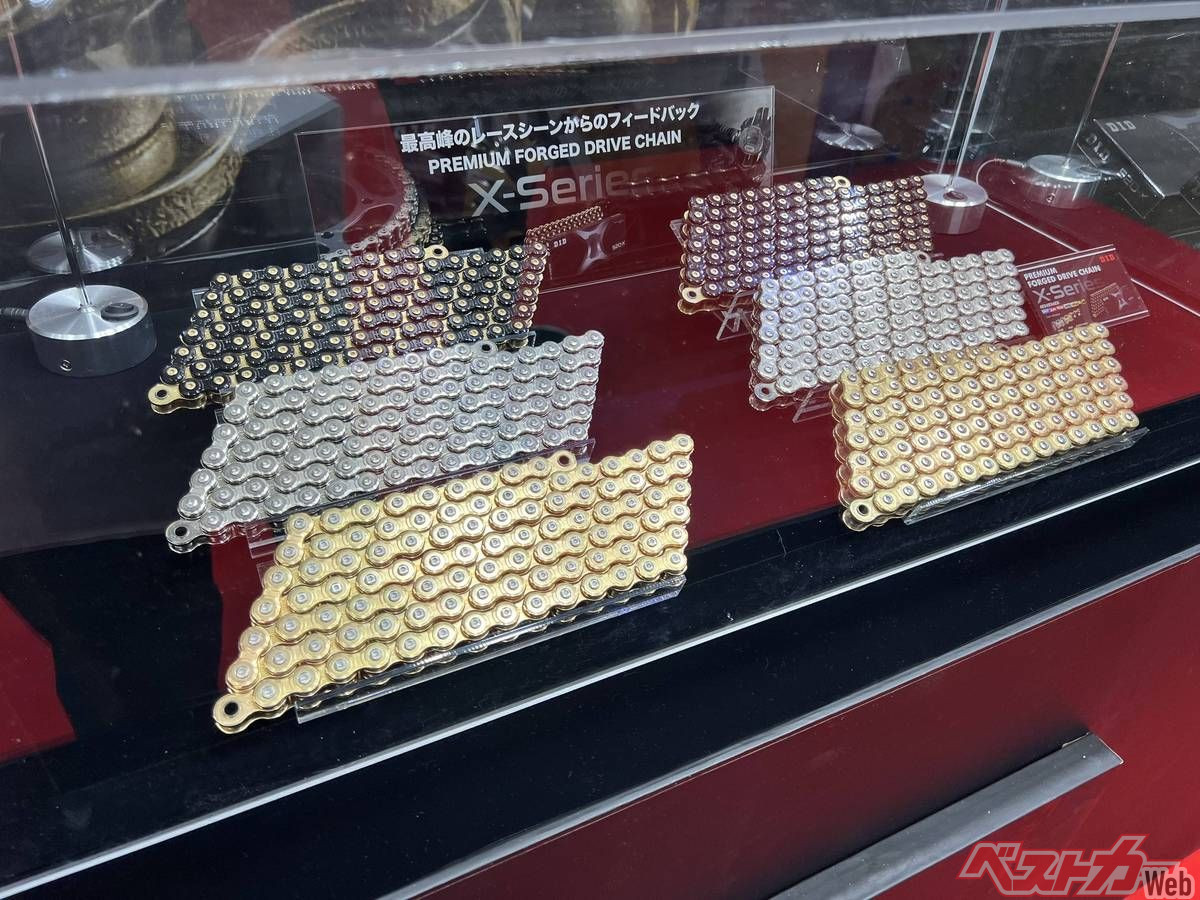 しかし、今回D.I.Dはこの鍛造プレートチェーンを「公道走行可能」スペックで新発売! 「X-Series」と名付けられた新型チェーンは、従来の同社最高峰モデル「ZVM-X」の上位グレードとして位置づけられるプレミアムモデル。2025年にも参考出品されていた本製品がついに市販化にこぎつけたのだ。その外見も特徴的で、肉抜き加工により「X」字型のデザインのプレートに精緻なディンプル加工が施されたピンを備え、一目見ただけでも通常グレードとの違いを感じられる。