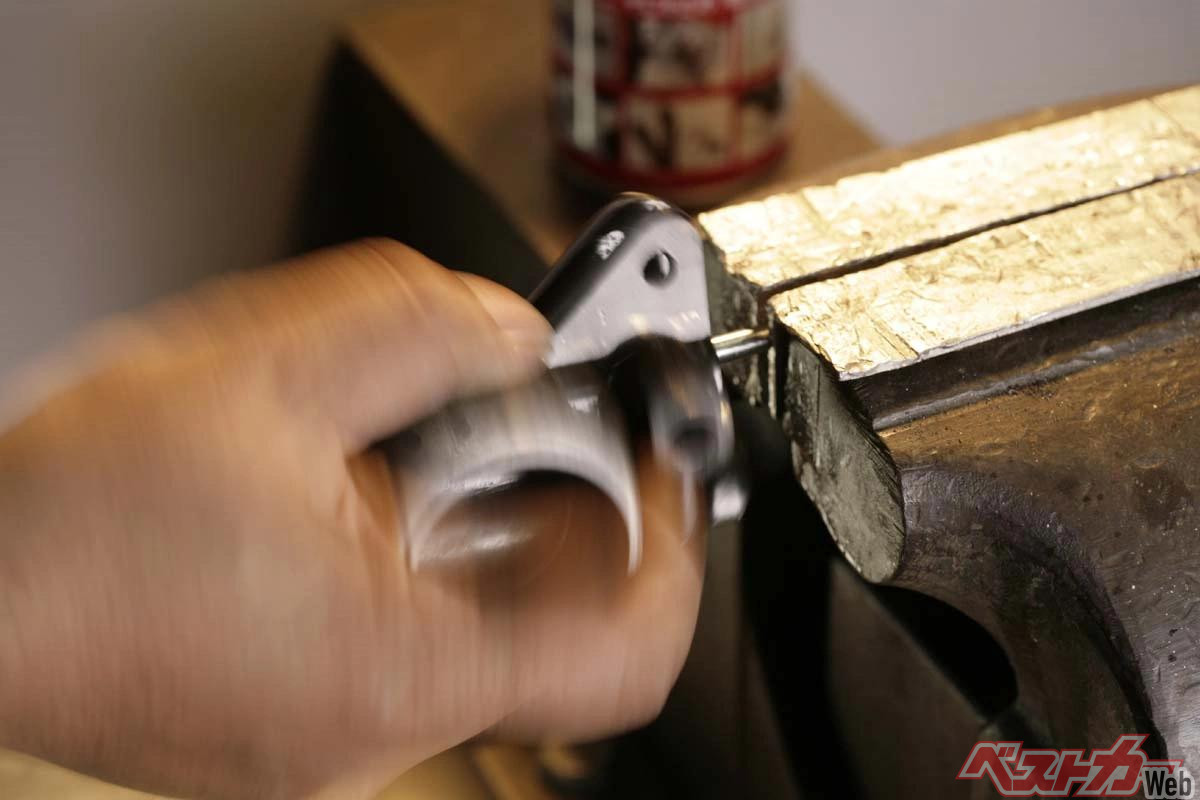 ボルトの段差面がレバーホルダーに触れるまで軽く締め付けてから、ロックナットでボルトを固定する。この際に、ボルトを締め付け過ぎると、ブレーキレバーの作動性が著しく悪くなってしまうので要注意だ。また、ガタがある時にはボルトの締め付けとロックナットをバランスさせながら締め付けよう。ボルトの頭をレンチで回らないように固定しながら、ロックナットを締め付けるのが手順だ。そもそもガタがあったり、締め付け不良を起こしていたレバーホルダーの場合は、状況確認しながら作業進行するのがよい。あまりに摩耗が進み、ガタが多くある際には、要所をシム調整することで、タッチが良いレバー操作感を回復できることもある。