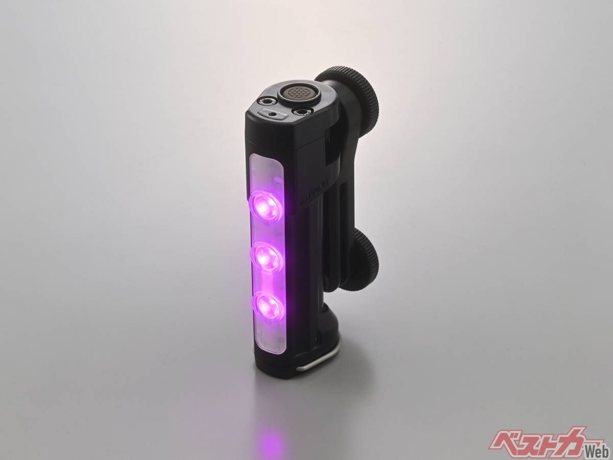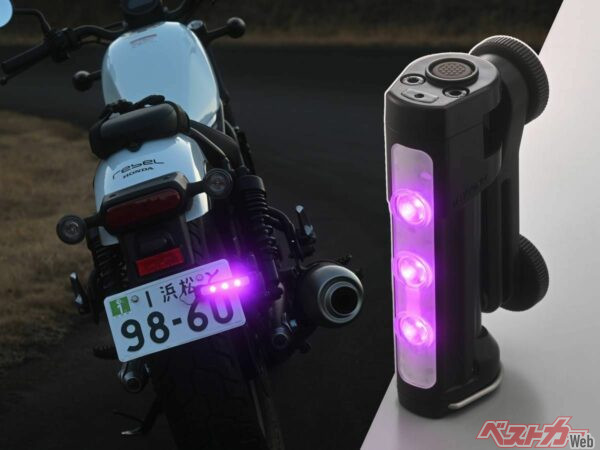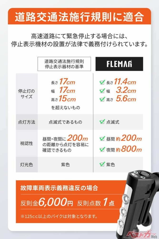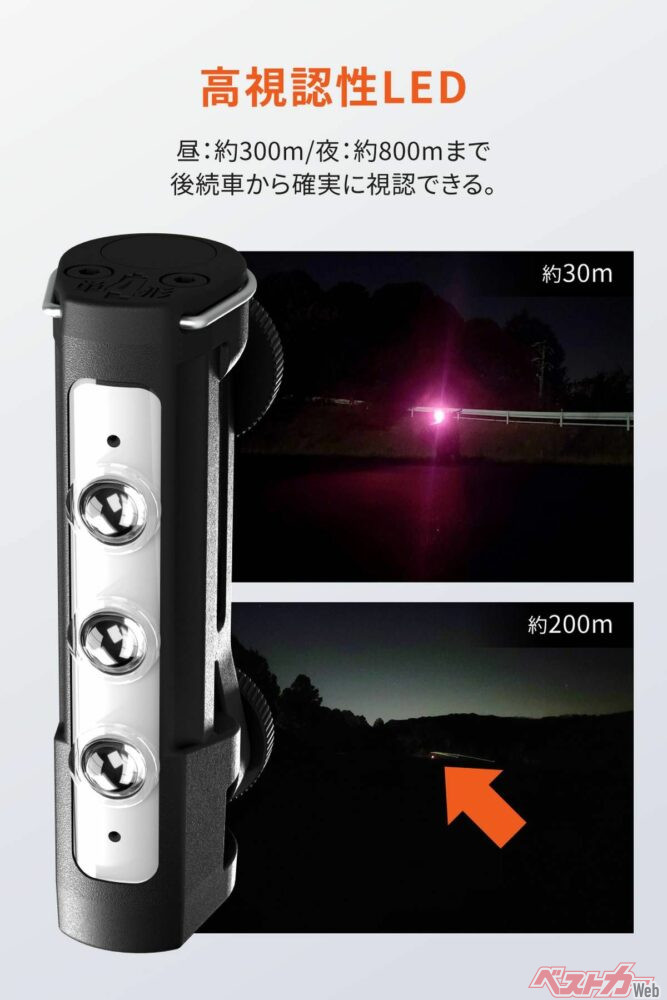 この問題を解決するのが、デイトナから登場した新製品「FLEMAG LED」だ。実は法的には、三角表示板の代わりとして紫色の光源も使用することができる。そこでFLEMAG LEDはコンパクトかつ強い光量を発揮できる紫色LEDを使用し、高い視認性を確保。夜間800m、昼間300mから視認でき、自車の位置を後続車へ安全に伝えることが可能だ。