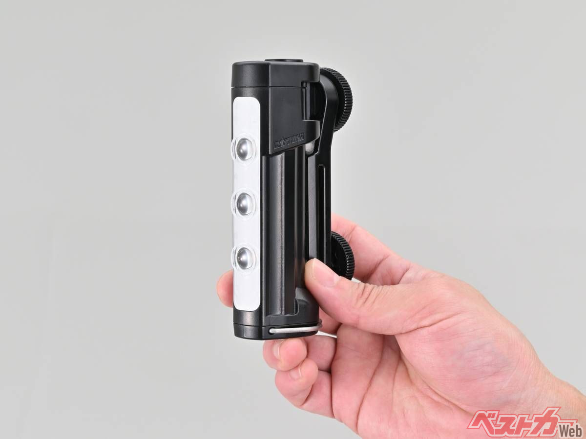 さらにこのアームは360度の回転域と本体の140度の回転域を組み合わせ、多様な角度で確実に発光面を指定することができる。また、標準装備のリングフックでリュックやバッグへぶら下げることもでき、自由度は非常に高い。