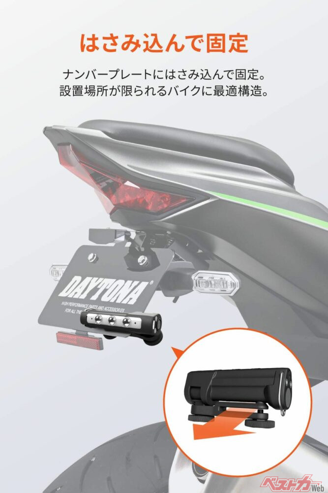 さらにFLEMAG LEDの注目ポイントはその固定方法にある。本体の3箇所に装着されたマグネットによりフェンダーやタンクといったスチールパーツに取り付けられるが、スーパースポーツやスクーターといったスチールパーツの少ないモデルでは、クリップ状になったアームによって「挟みこむ」固定が可能なのだ。