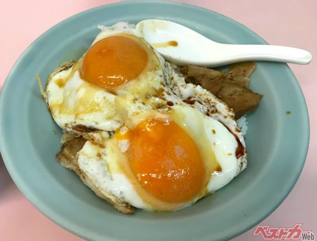 白米の上に甘辛いタレを絡めた焼豚と、半熟の目玉焼きを乗せたB級感たっぷりの丼飯で、