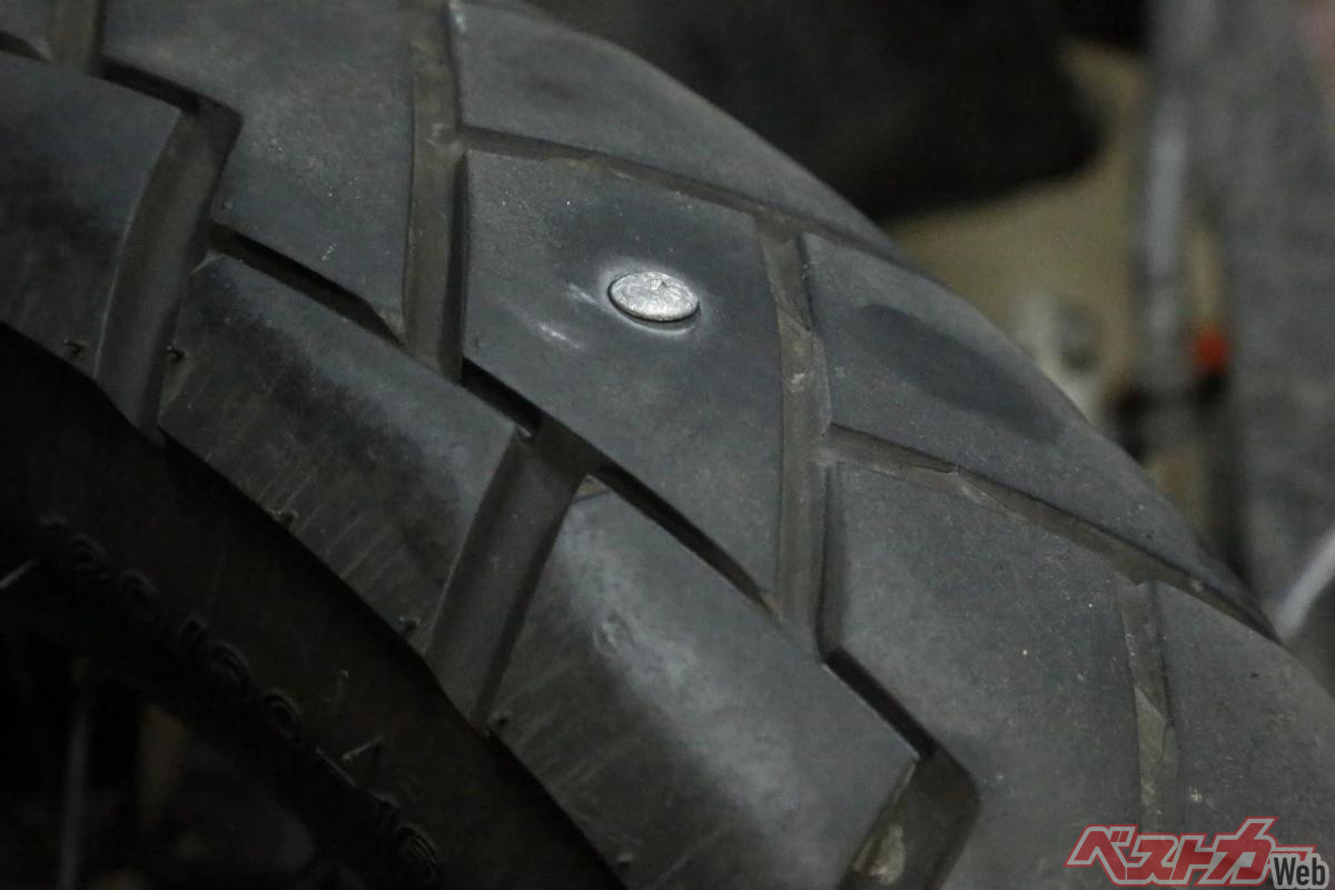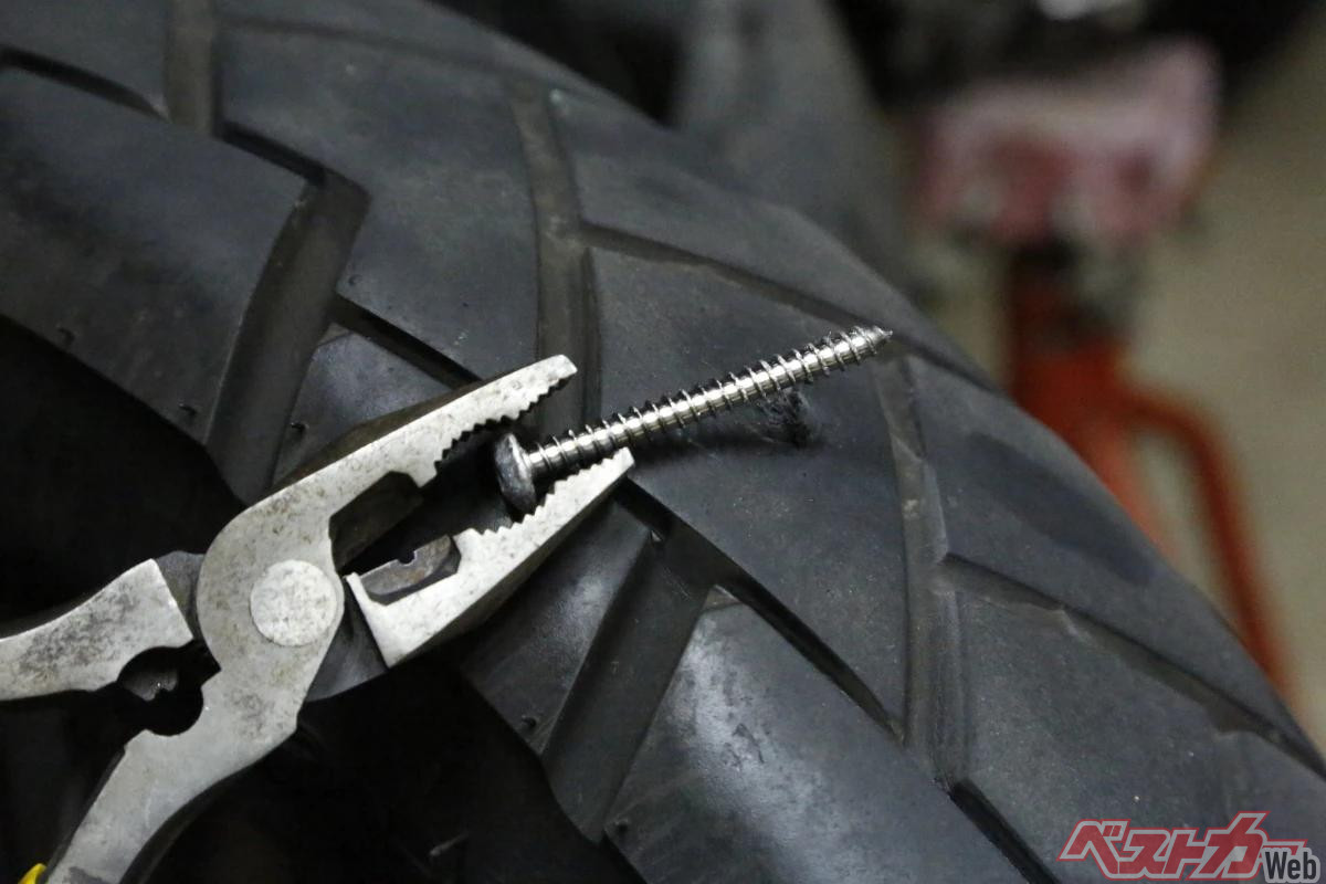 文字通りチューブのないチューブレスタイヤは、タイヤ内面とホイールリム内面がひとつの空気室になっているため、刺さった釘が抜けるまでの間は空気の漏れが少ないまま走行できることがあります。これは釘が栓になっているような状態です。